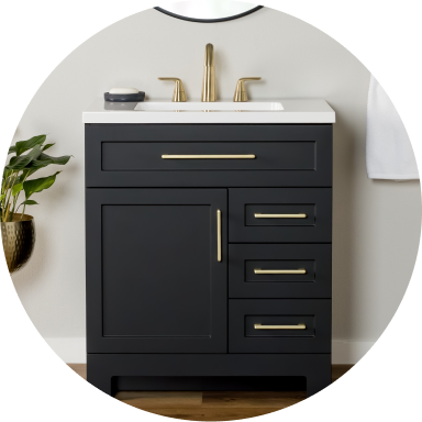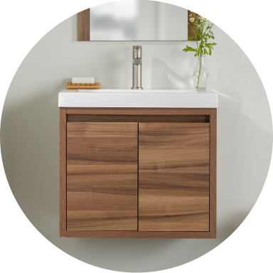 A: A sink is a stand-alone vessel for tasks like washing your hands. It has at least one water tap. A vanity is the cabinet that supports the sink and countertop. A vanity adds counter space and hides plumbing. At Lowe’s, we offer many vanity styles to choose from, including freestanding, wall mounted/floating, corner, slimline, double basin and more.