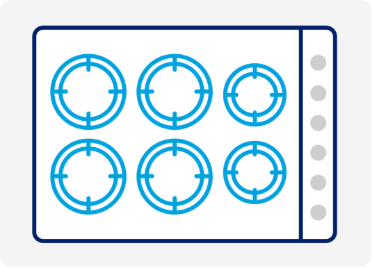 Depending on your kitchen’s blueprint, you’ll want to consider how much space you’re working with before deciding on which cooktop to choose. From space-saving 30-inch cooktops to more generous 36-inch cooktops, choose a size that best suits your lifestyle and needs. In addition to size, you can also shop cooktops by the number of burners. If you only cook occasionally for one to two people, you might want to consider a four-burner or a two-burner cooktop. If you cook regularly for a family, you may want to invest in a cooktop with many burners, like a five-burner or six-burner cooktop.