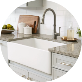 If you’re putting in your new sink yourself, drop-in sinks are an easy-to-install option, and they come in a variety of finishes and configurations, including corner sinks. These sinks drop into place from above the countertop and are a popular do-it-yourself choice. Refer to our guide How to Install a Drop-In Kitchen Sink for more tips. If you don’t like the look of the lip on a drop-in sink or if you’re looking for an option that offers easier cleanup, go for an undermount kitchen sink that’s installed beneath the countertop. For an even easier and more cost-effective installation solution, explore our range of all-in-one sink kits that include a sink, faucet and installation accessories. Looking to add a prep sink to a kitchen or a small sink to your home bar? Bar sinks have a small, single-bowl design that doesn’t take up much room, which is ideal for these types of small spaces.