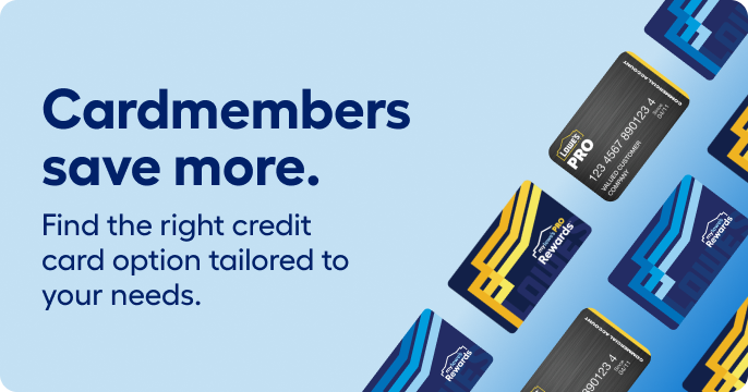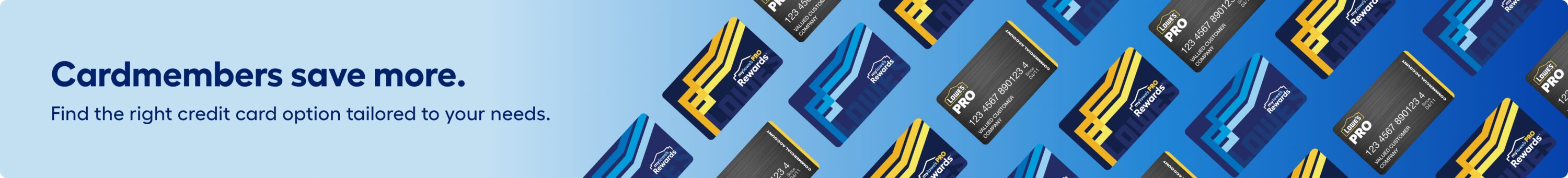 ††Subject to credit approval. 5% offer applies to eligible US Lowe’s store and Lowes.com purchase or order after all other applicable discounts charged to your MyLowe’s Pro Rewards Credit Card. Customer must pay applicable sales tax. Offer can’t be used in conjunction with or on: (i) other credit-related promotional offers unless otherwise stated; (ii) any other promotion, discount, markdown, coupon/barcode, rebate or offer, including any Lowe’s volume or special discount programs (such as but not limited to, Contractor Pack, Buy in Bulk, Value Savings Program (“VSP”), Special Value, New Lower Price, Was: Now, Military Discount, Employee Discount, and Lowest Price Guarantee); (iii) associate discretion price adjustments; (iv) any services (such as but not limited to, rentals; extended protection/replacement plans; shipping, delivery, assembly or installation fees); (v) fees or taxes; (vi) previous sales; (vii) gift cards; or (viii) Weber, Kichler, or Miele products.