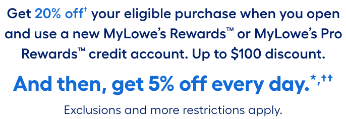 †Subject to credit approval. To qualify for this offer, you must apply, be approved, and use a new MyLowe’s Pro Rewards Credit Card or MyLowe’s Rewards Credit Card. Limit one 20% off coupon per new credit account; offer is not transferable. Max discount is $100 with this offer. Offer can’t be used in conjunction with or on: (i) 5% Off Every Day offer or any other credit-related discount offer; however, if the 5% Off Every Day discount offer is greater than $100, the greater discount will automatically be applied; (ii) any other promotion, discount, markdown, coupon/barcode, rebate or offer, including any Lowe’s volume or special discount programs (such as but not limited to, Contractor Pack, Buy in Bulk, Value Savings Program (“VSP”), Special Value, New Lower Price, Was: Now, Military Discount, Employee Discount, & Lowest Price Guarantee); (iii) associate discretion price adjustments; (iv) any services (such as but not limited to, rentals; extended protection/replacement plans; shipping, delivery, assembly or installation fees); (v) fees or taxes; (vi) previous sales; (vii) gift cards; or (viii) Weber, Kichler, or Miele products. Coupon is not redeemable for cash, not transferable & can’t be replaced if lost or stolen. Void if altered, defaced, copied, transferred, or sold (thru any on-line auction or otherwise). Customer must pay applicable sales tax.