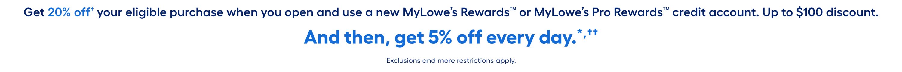 *Subject to credit approval. 5% offer applies to eligible US Lowe’s store and Lowes.com purchase or order after all other applicable discounts charged to your MyLowe’s Rewards Credit Card. Customer must pay applicable sales tax. Offer can’t be used in conjunction with or on: (i) other credit-related promotional offers; (ii) any other promotion, discount, markdown, coupon/barcode, rebate or offer, including any Lowe’s volume or special discount programs (such as but not limited to, Contractor Pack, Buy in Bulk, Value Savings Program (“VSP”), Special Value, New Lower Price, Was:Now, Military Discount, Employee Discount, and Lowest Price Guarantee); (iii) associate discretion price adjustments; (iv) any services (such as but not limited to, rentals; extended protection/replacement plans; shipping, delivery, assembly or installation fees); (v) fees or taxes; (vi) previous sales; (vii) gift cards; or (viii) Weber, Kichler, or Miele products.